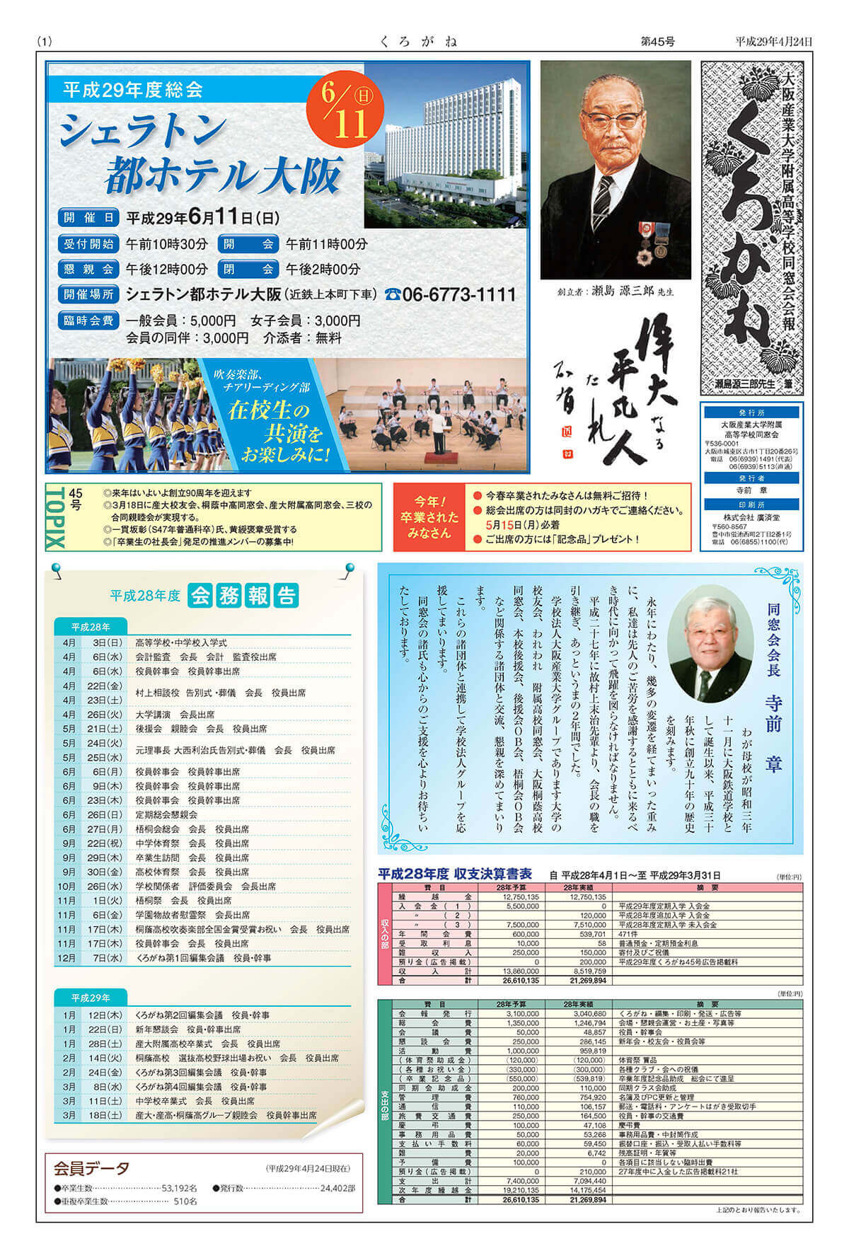 今号も卒業生たちメッセージや活躍をはじめ、今の大阪産業大学付属高等学校生についてなども情報盛りだくさんの同窓会機関新聞「くろがね」が発行されました。